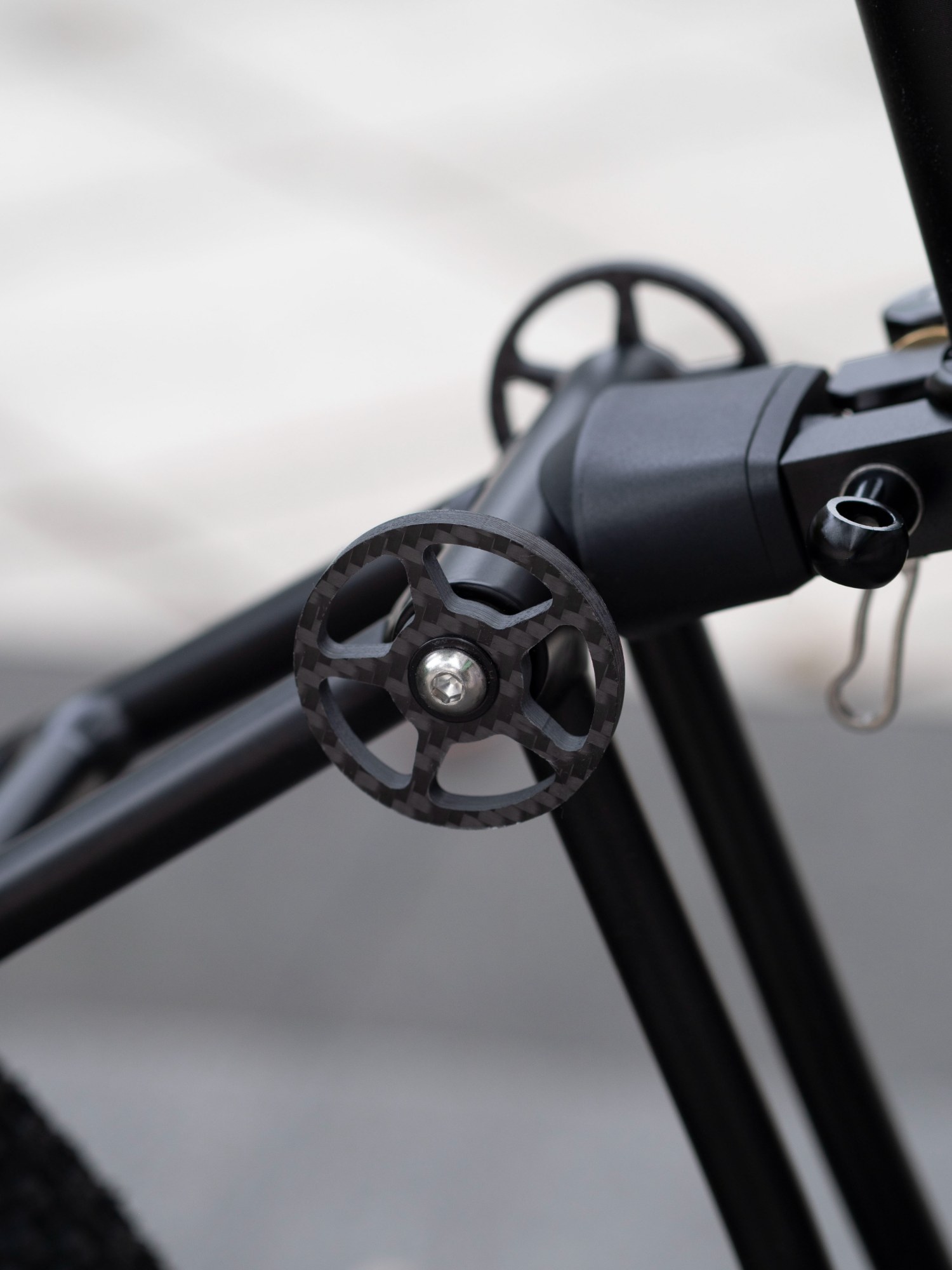 這可是碳纖維前叉喔!142mm 貫通軸後叉 + 74mm碳纖前叉: 這是登山車等級的規格下放!大幅提升車身剛性,且拆卸後輪不再需要開口板手,維修便利性大增。