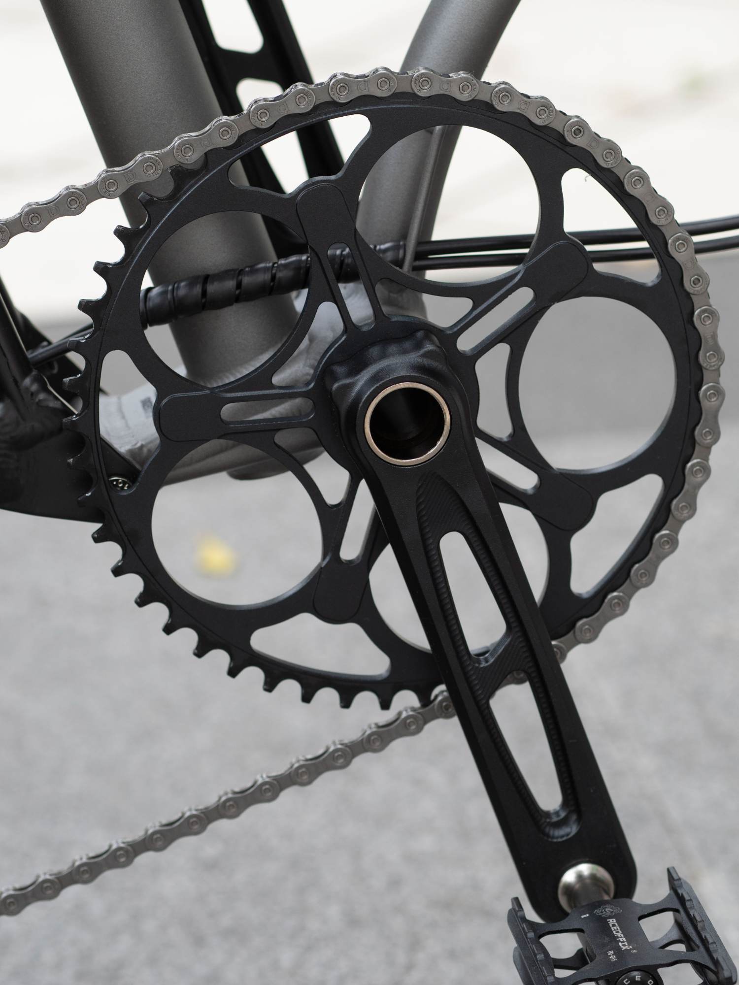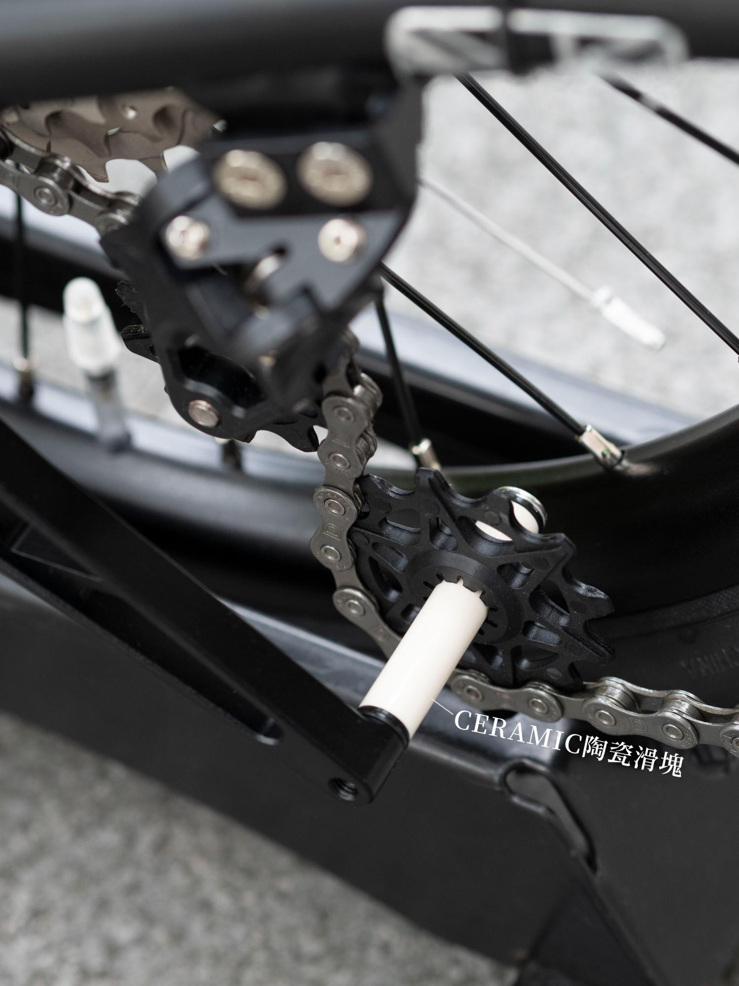 後變速器下方白色部分為 陶瓷滑塊,可讓下導輪有Z軸的位移能力,這...算是三摺車特殊結構所誕生的專屬產物 XD