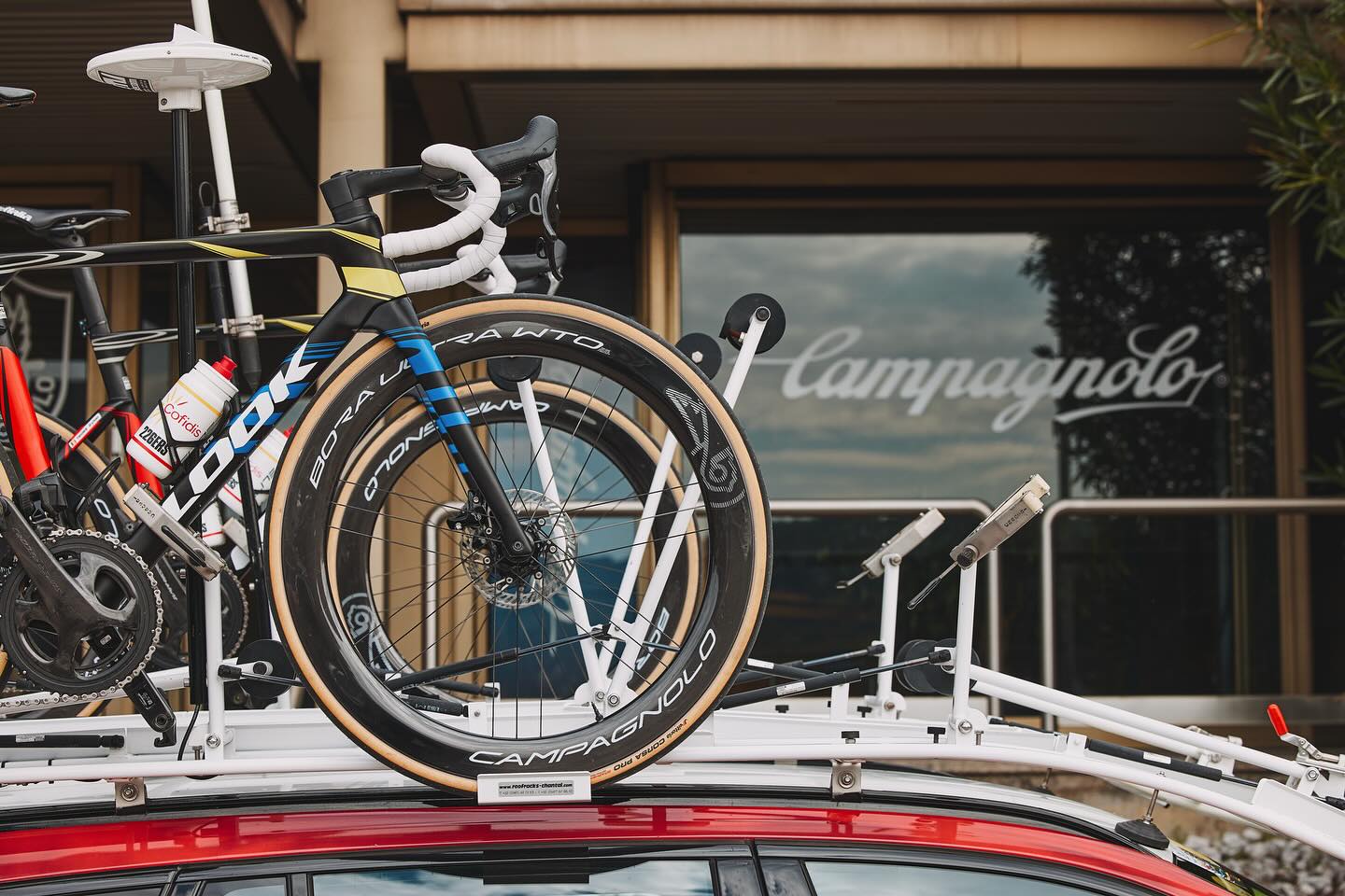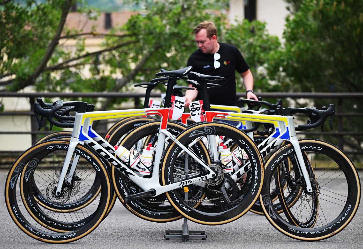 Cofidis隊車全面搭載最新的 Super Record 13速無線電變與 BORA Ultra WTO系列輪組,目前新推出的 WTO 45 C23重量為 1,325g喔!以鋼絲輪組來說算是上乘的規格。